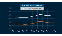 5月8日(月) 時点のレギュラーガソリンの全国平均は、163.4円となり0.3円の値下がり。2週間ぶりの値下がりとなりました。
