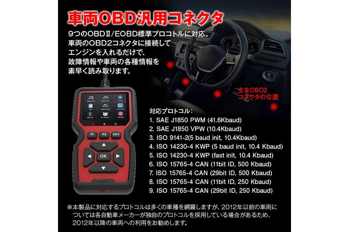 9つのOBD2/EOBD標準プロトコルに対応。