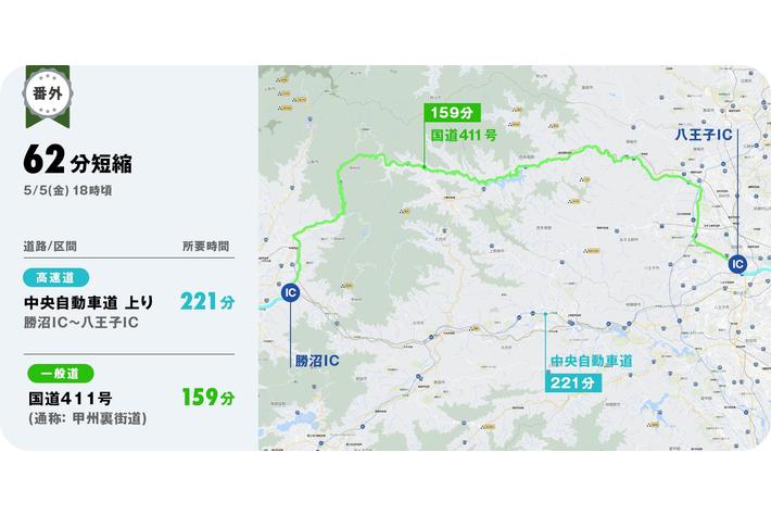 また、番外編として、走行距離が高速道路走行時(勝沼IC~八王子IC間:約64km)と比べて、約1.5倍(約99km)と長距離の回避ルートですが、それでも所要時間を約1時間短縮できた意外性のあるルートもありました。