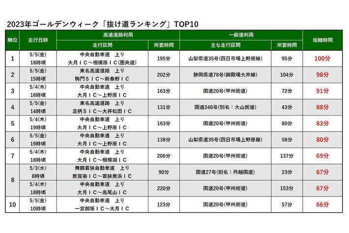 株式会社ナビタイムジャパン(代表取締役社長:大西啓介、本社:東京都港区)のドライブ事業は、2023年ゴールデンウィークのカーナビアプリの走行実績を分析し、高速道路と比べて所要時間の短かった、一般道を使った「抜け道ランキング」を発表いたします。