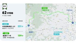 また、番外編として、走行距離が高速道路走行時(勝沼IC~八王子IC間:約64km)と比べて、約1.5倍(約99km)と長距離の回避ルートですが、それでも所要時間を約1時間短縮できた意外性のあるルートもありました。