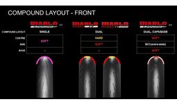 ⚫DIABLO ROSSO(TM) IV CORSA よりソフトでワイドなコンパウンドをサイドに採用しています。タイヤショルダーの下にあるベースは、汎用性が高く、熱安定性に優れ、低温から高温まで安定した性能を発揮するタイヤをサポートします。