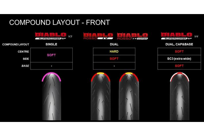 DIABLO(TM) SUPERCORSA V3 と比較して、DIABLO(TM) SUPERCORSA V4 は、新しいトレッドパターン、新しいコンパウンドとコンパウンドレイアウト、新しい構造、新しいプロファイルを備えています。
