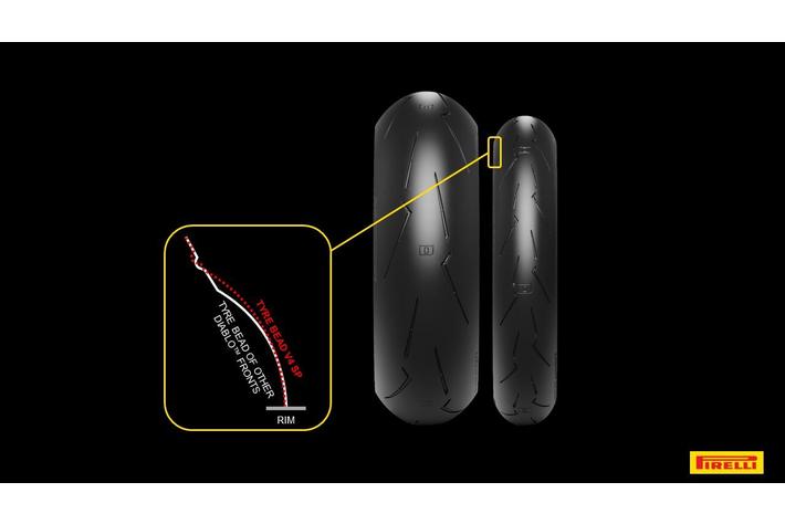 さらに、DIABLO(TM) SUPERCORSA V4 SP のフロントタイヤビードは、一般道でのメーカー指定空気圧とレーストラックでの専用空気圧(フロント 2.3Bar、リア 2.1Bar、ウォームタイヤ)の両方で最高のパフォーマンスを発揮するように設計されています。サーキットでは推奨タイヤ空気圧が指定されていることで、DIABLO(TM) SUPERCORSA V4 SP は他のピレリ・ハイパースポーツタイヤより簡単にスポーツ走行を楽しめます。
