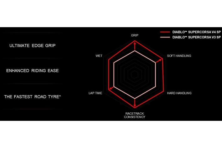 DIABLO(TM) SUPERCORSA V4 SP は、DIABLO(TM)の歴史に新たな 1 ページを刻みます。前作と比較して、V4 は完全にリニ ューアルされた製品です。新しいトレッドパターン、新しいコンパウンドとコンパウンドレイアウト、新しい構造、新しいプロファイルが特徴です。V4 は、FIM スーパーバイク世界選手権、スーパーストック 1000、その他多くの国内外レースで SC コンパウンド(SCQ、SCX、SC0、SC1、SC2)の DIABLO(TM) SUPERCORSA タイヤを使用してきたピレリのタイヤサプライヤーとしての経験が直接的に反映された製品なのです。