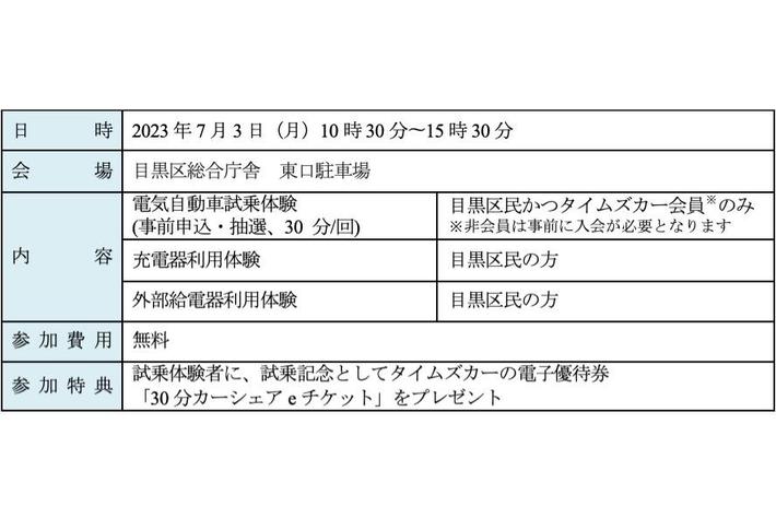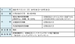 なお、車両を導入する7月3日(月)には、目黒区民の方を対象に、本事業およびEVをより身近に感じていただくことを目的に、電気自動車の試乗体験などができる「電気自動車体験イベント」の開催を予定しています。
