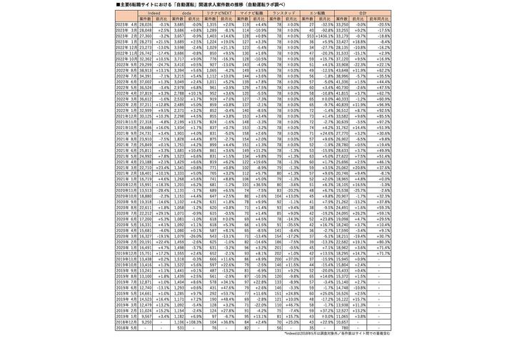 主要転職6サイト別では、Indeedが前月比0.1%減の28,026件、dodaがほぼ横ばいの3,685件、リクナビNEXTは同2.0%増の1,315件、マイナビ転職が同4.4%増の119件、ランスタッドは前月と変わらず78件、エン転職が同32.5%減の27件となりました。