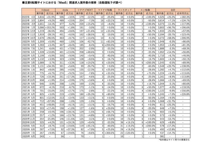 「MaaS」の関連求人案件数(主要転職6サイト)は2023年4月末時点で、前月比25.2%増、前年同月比182.3%増の4,525件となり、過去最高件数を更新しています。