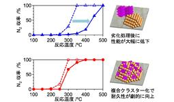 本研究では、活性成分であるロジウムを比較的安価な元素であるモリブデンと複合クラスター(*2)化するという調製手法を開発し、得られた担持ロジウム-モリブデン触媒(図1)が優れた耐久性を示すことを見いだしました。一般的な手法では、担持ロジウム-モリブデン触媒は、ロジウムおよびモリブデンの別々の前駆体(*3)を用いて調製されます。一方、本研究では、あらかじめロジウムとモリブデンを複合クラスター化したうえで触媒を調製します(図2)。一般的な手法ではロジウムとモリブデンが別々の微粒子を形成するのに対し、本手法では、ロジウムとモリブデンが効率的に混ざった微粒子が形成されます。1000ºCという高温で劣化処理(*4)を施し、触媒の耐久性を評価したところ、一般的な手法の触媒では、大きな性能の低下が見られました。一方、本手法の触媒では耐久性が劇的に向上し、劣化処理による性能の低下はほとんどありませんでした(図3)。触媒の構造解析や反応メカニズムの評価から、複合クラスター化によってロジウムとモリブデンが微粒子中で効率よく混ざり、ロジウムとモリブデンの界面が高密度に形成されたことが重要であることを明らかにしました。