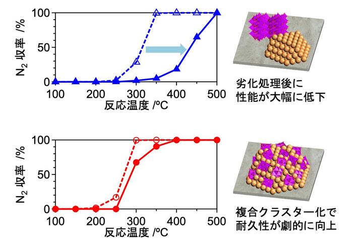 図3. 劣化処理前(破線)と処理後(実線)の触媒性能