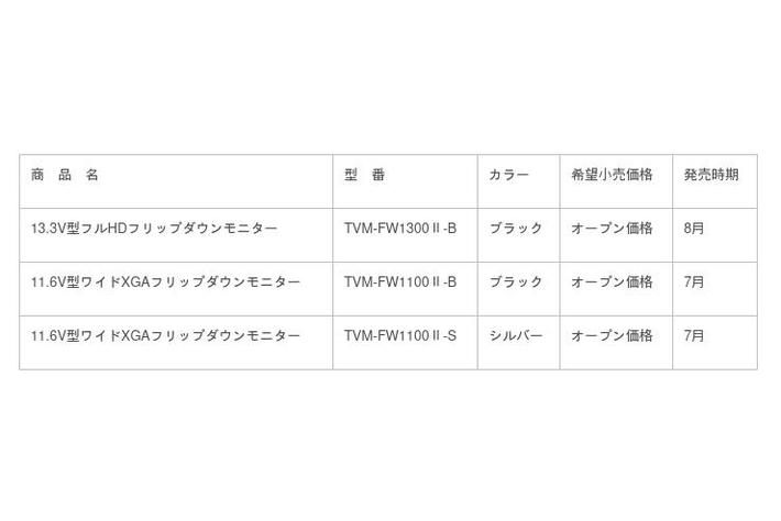 パイオニアは、それらのコンテンツを臨場感のある映像で楽しめるフリップダウンモニターとして、13.3V型フルHDパネルで高精細な大迫力映像を表示する最上位モデル「TVM-FW1300II-B」と、11.6V型ワイドXGAパネルを搭載し、ブラックカラーとシルバーカラーをラインアップした「TVM-FW1100II-B/-S」を発売します。