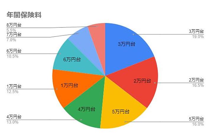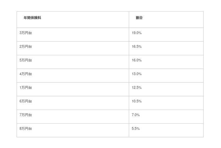 この調査によれば、一年間の自動車保険料として最も多いのは3万円台で19.0%、5万円以下(1~4万円台)が合計61%を占めています。また、1万円台の保険料を支払う人が12.5%もいるという結果は予想外でした。ただし、保険料は等級、走行距離、車両保険の有無などにより大きく変動するため、一概には言えませんが、1万円台の保険料を支払う人はおそらく18~20等級で最小限の補償プランを選んでいると考えられます。