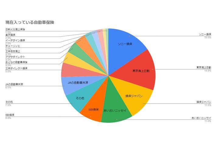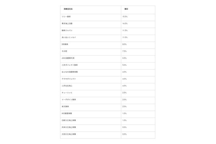 今回のアンケート結果での自動車保険加入率では、ソニー損保が1位(15.5%)、東京海上日動が2位(14.5%)です。ダイレクト型保険会社(ネットで見積もり・加入が可能なタイプ)はソニー損保とSBI損保の2社、代理店型は東京海上日動、損保ジャパン、あいおいニッセイ同和損保の3社が上位5社に入っています。新車購入時にディーラーから任意保険も加入する場合は、主に代理店型が選ばれます。ソニー損保のダイレクト型保険が上位にランクインしているのは、保険料と補償のバランスと、テレビCMなどでの高い認知度が要因と考えられます。