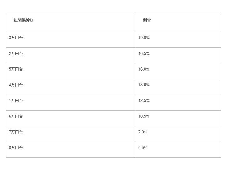 この調査によれば、一年間の自動車保険料として最も多いのは3万円台で19.0%、5万円以下(1~4万円台)が合計61%を占めています。また、1万円台の保険料を支払う人が12.5%もいるという結果は予想外でした。ただし、保険料は等級、走行距離、車両保険の有無などにより大きく変動するため、一概には言えませんが、1万円台の保険料を支払う人はおそらく18~20等級で最小限の補償プランを選んでいると考えられます。