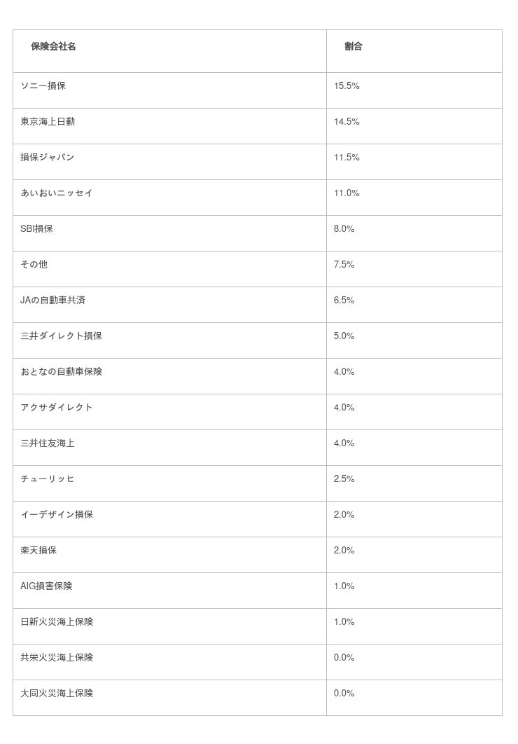 今回のアンケート結果での自動車保険加入率では、ソニー損保が1位(15.5%)、東京海上日動が2位(14.5%)です。ダイレクト型保険会社(ネットで見積もり・加入が可能なタイプ)はソニー損保とSBI損保の2社、代理店型は東京海上日動、損保ジャパン、あいおいニッセイ同和損保の3社が上位5社に入っています。新車購入時にディーラーから任意保険も加入する場合は、主に代理店型が選ばれます。ソニー損保のダイレクト型保険が上位にランクインしているのは、保険料と補償のバランスと、テレビCMなどでの高い認知度が要因と考えられます。