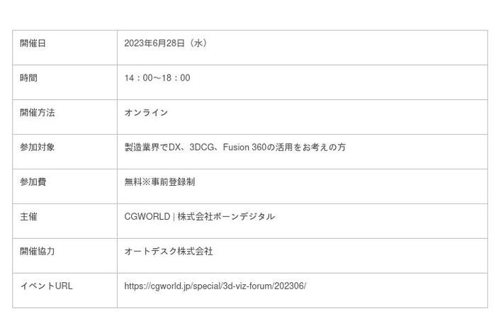 株式会社ボーンデジタル(本社:東京都千代田区、CEO:新和也、URL:https://www.borndigital.co.jp/)は製造業での3DCGの活用方法を探るオンラインイベント「Autodesk Fusion 360 Special|3D VISUALIZER FORUM」を