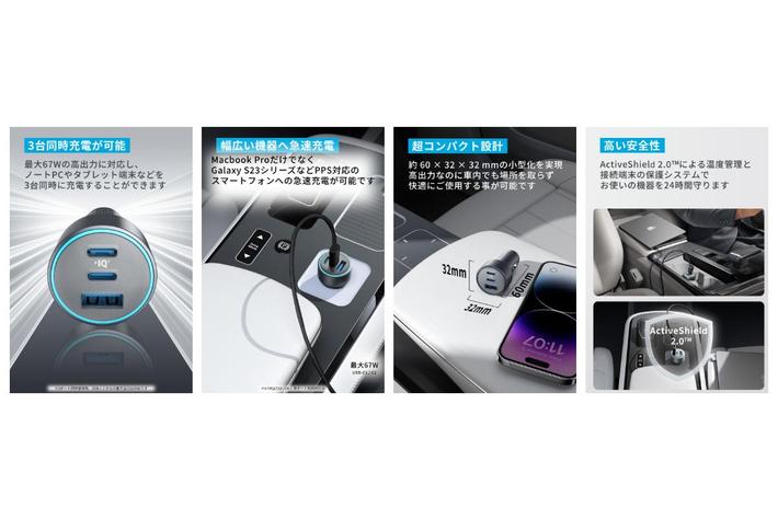 Ankerのカーチャージャー史上最高出力&3ポート搭載し、移動中の車内でもノートPCとタブレット端末、スマートフォンを3台同時に充電が可能な一台。USB-Cポートは最大67W出力で、MacBook Proにも充電できる他、発熱を抑えながら接続機器に合わせて効率的に充電するProgramable Power Supply(以下PPS)に対応しているため、Galaxy S23シリーズにも急速充電が可能です。またUSB-Aポートは最大22.5W出力のため、同時にiPhoneも充電ができます。幅広い機器に合わせて最適な充電を行うPowerIQ 3.0(Gen2)や温度管理や過充電防止等の多重保護システムに加え、充電時の温度上昇を監視し、充電器本体が規定の温度に達した場合は、電流 / 電圧の負荷度合いを調節することで、過度の温度上昇を未然に防ぐ「ActiveShield(TM)️ 2.0」も搭載しています。