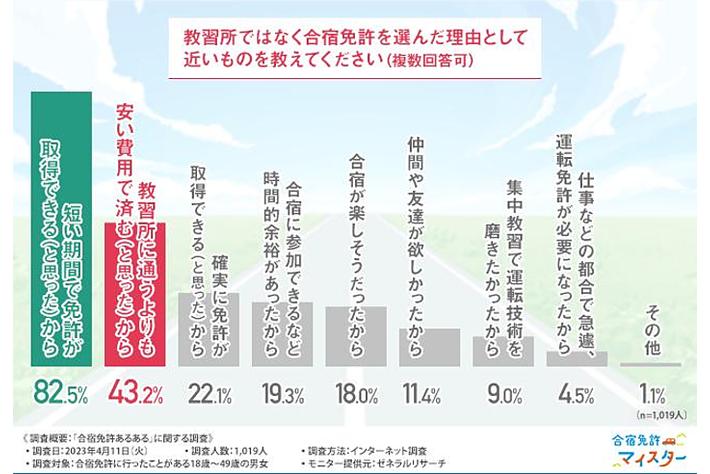 今回の調査で、短期間で運転免許の取得が目指せることを理由に合宿免許を選択した方が8割を超え、圧倒的に多いことが明らかになりました。