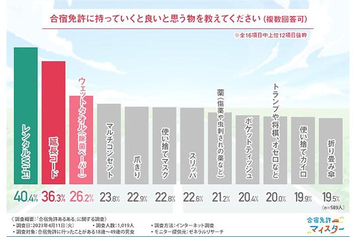 続いて、「合宿免許に持っていくと良いと思う物を教えてください(複数回答可)」と質問したところ、 『レンタルWi-Fi(40.4%)』という回答が最も多く、次いで 『延長コード(36.3%)』『ウェットタオル(除菌ペーパー)(26.2%)』『マルチコンセント(23.8%)』『爪きり(22.9%)』と続きました。