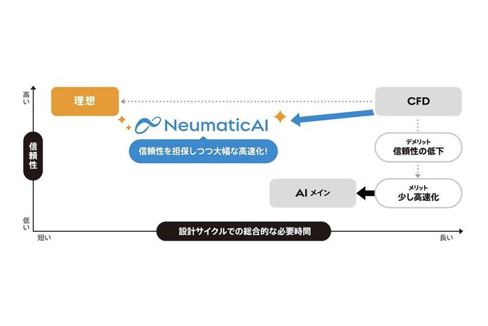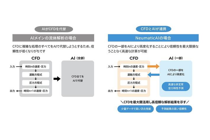 一方でNeumaticAIでは、CFDの一部のみをAIにより高度化しているため、高速化を実現しつつ、高い信頼性も実現しています。また、AIが担う部分を限定しているために、少量の学習データで高い汎化性が期待できます。