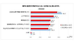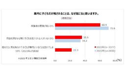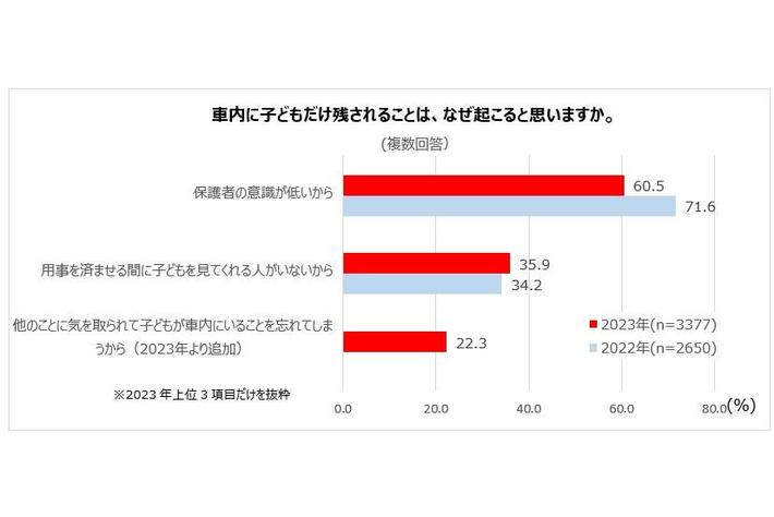 「車内に子どもだけ残されることは、なぜ起こると思いますか」という質問に対しては、「保護者の意識が低いから」が最多で60.5%(昨年度から11.1ポイント減)、「用事を済ませる間に子どもを見てくれる人がいないから」が35.9%、「他のことに気を取られて子どもが車内にいることを忘れてしまうから」が22.3%となりました。