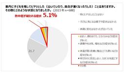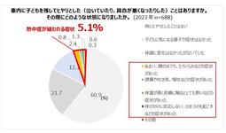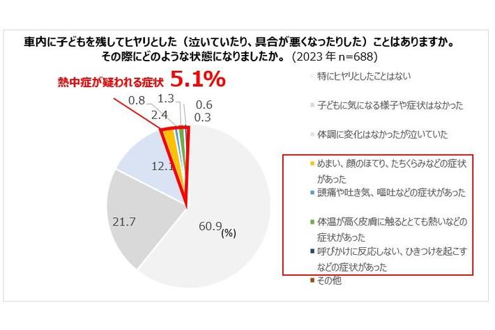 ・1年以内に子どもを残したまま車を離れたことがあるとした人は20.4%。うち、5.1%は、めまい、顔のほてり、体温が高いなどの子どもの不調を経験。