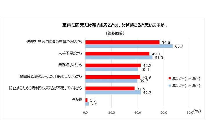 「車内に園児だけ残されることは、なぜ起こると思いますか」という質問に対しては、「送迎担当者や職員の意識が低いから」が昨年度から10.1ポイント減少し56.6%となりました。また、「人手不足だから」、「業務過多だから」、「登園確認等のルールが形骸化しているから」は昨年度からそれほど大きな変化がなく、それぞれ49.1%、42.3%、41.9%となりました。
