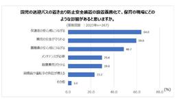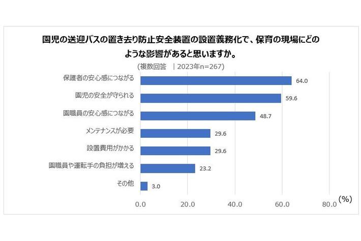 設置義務化で現場にどのような影響があるかたずねたところ、「保護者の安心感につながる」が64.0%、「園児の安全が守られる」は59.6%となりました。また、職員や運転手の負担増を上げた人も23.2%いました。設置が進み、使用体験が増えることで、これらの傾向にどのような変化があるかが注目されます。