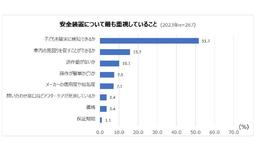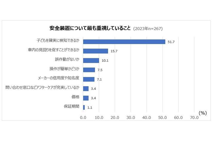 置き去り防止装置について最も重要視していることでは、「子どもを確実に検知できるか」が51.7%を占め、車内の見回りを促す性能や価格といった他の理由を大きく上回って、重視しされていることが示されました。