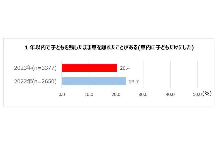 1年以内に子どもを残したまま車を離れた(車内に子どもだけにした)と回答した人は20.4%で昨年度から微減となりました。また、子どもを残して車を離れたとした人にそれを認識していたかをたずねると、98.1%は認識していましたが、1.9%は認識していなかったとし、わずかながらも無意識の置き去りが発生していることが明らかになりました。