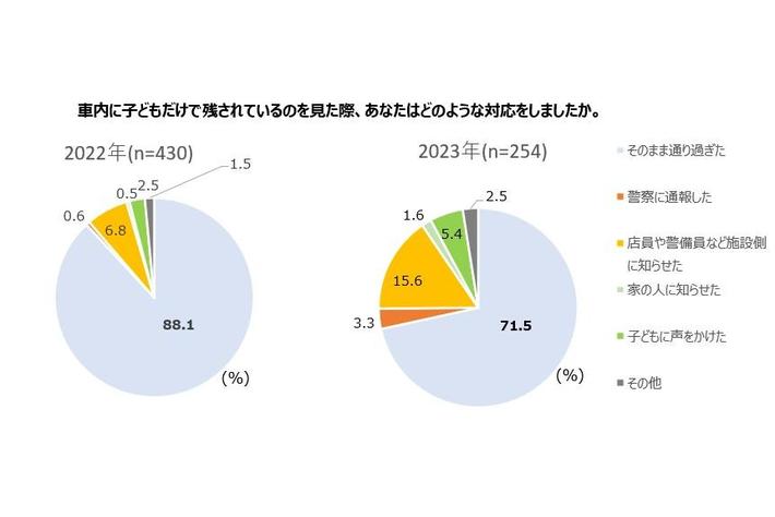 1年以内に車内に子どもだけで残されているのを見たことがある人に、その際どのような対応をしたかたずねると、「そのまま通り過ぎた」は71.5%と昨年度から16.6ポイント減少し、施設、警察、家の人に知らせるなどの対応をとった人は昨年度から増加しました。熱中症の危険性の認知拡大とともに、対応をとる人が増えていることが伺えました。