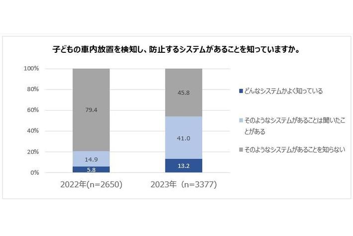 ・車内置き去り検知システムへの認知は昨年より高まるも、45.8%が知らないと回答。