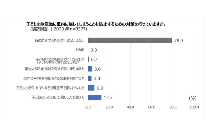 こうした中、「子どもを無意識に車内に残してしまうことを防止するための対策を行っていますか」という質問に対しては、78.9%が「特に防止するために対策を行ったことはない」と回答しました。無意識の置き去りが発生することはある程度認識しているものの、多くが対応を取れていない実態が明らかになりました。