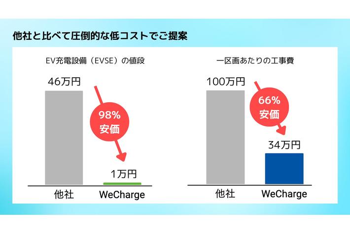 WeChargeは独自のプラットフォーム集中管理により、駐車場1区画あたりの充電設備を他社よりも約66%ほど安価に設置が可能です。そして、この度WeCharge HUBが従来の6kWから最大10kW対応したことで、より高い充電速度が求められる充電ニーズにも将来的に対応可能となります。