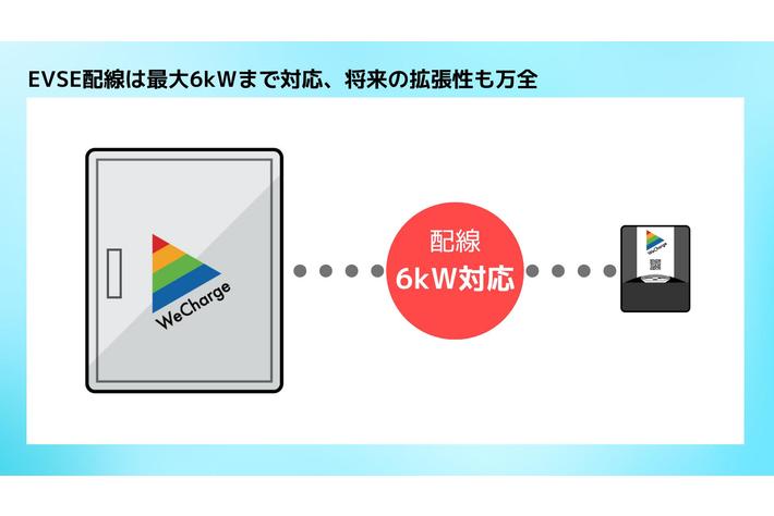 EVのバッテリー性能の向上やコネクター規格の変更に対応できるよう、WeChargeの配線ケーブルは15A / 3.0kWでも8 Sq以上が標準施工仕様で、EV充電設備は最大6kWまで拡張可能です。電化製品やスマートデバイスが進化してもお部屋のコンセントが変わらず使えるように、WeChargeのEV充電設備も同様に将来も変わらずお使いいただけます。