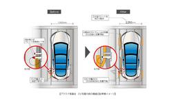 車種によって異なるEV車の充電口蓋の位置にあわせ、「幅寄せガイドレール」をパレットの左右どちらかに設置。充電口蓋の開閉に必要なスペースを強制的に確保して駐車することができる。