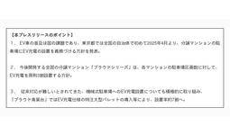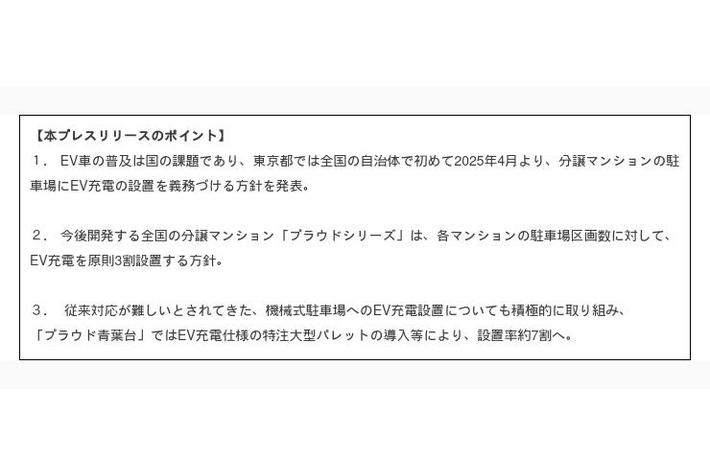 分譲マンションのEV充電設備、東京都の2025年より設置義務化に先行対応、プラウドシリーズ全物件で、「EV充電設備」設置率原則3割に