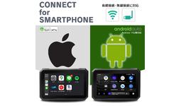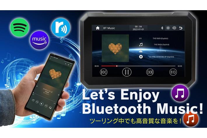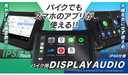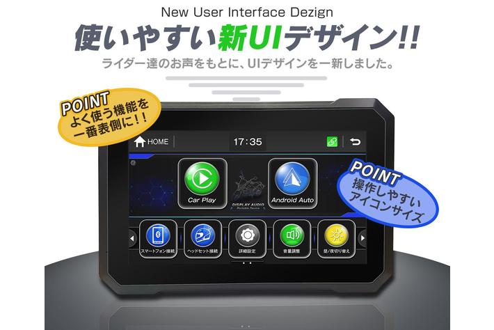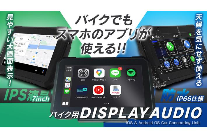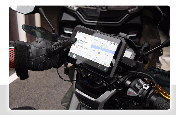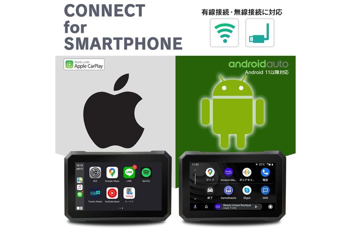 バイク用の7インチポータブルディスプレイオーディオ。Android Auto、Car Play対応のスマートフォンから無線で接続可能。