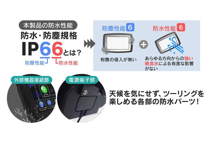 防水基準IP66を取得。防水仕様なので、バイクで出掛けている最中に雨が降った場合でも水の侵入を防ぎ、機器の故障を防ぎます。