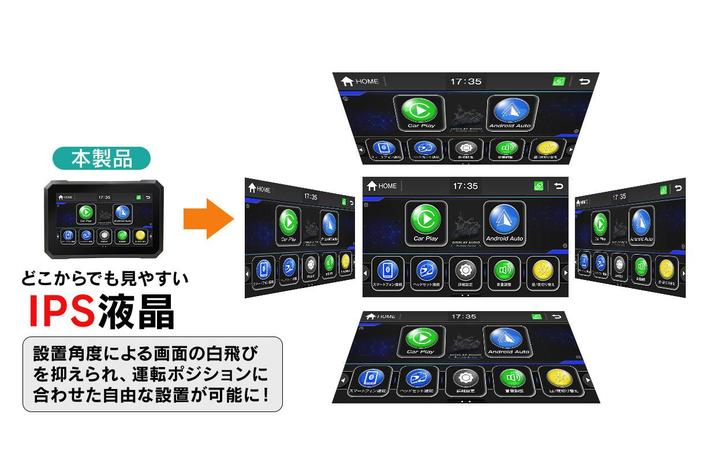 バイクで使用するので、直射日光が当たりやすく、姿勢によって角度が変わり画面が見にくくなることも考えられますので、本製品は高輝度なIPS液晶を採用しています。IPS液晶はどの角度から見ても見やすい構造となっているので、バイク用のディスプレイオーディオに最適です。