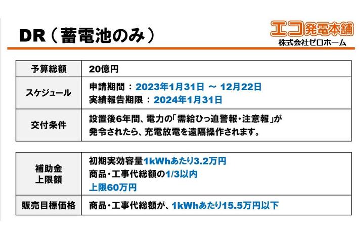 2点目:蓄電池は「DR補助金」という補助金も別途公募されており、蓄電容量次第では、DR補助金が補助額が高額です。