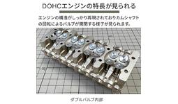 エンジン模型でもその構造はしっかり再現されており、カムシャフトの回転によるバルブが開閉する様子が見られます。