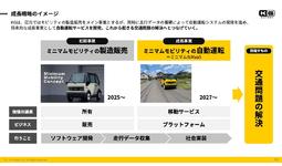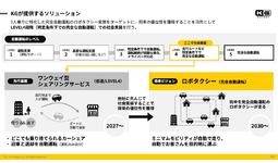 将来的には完全自動運転で、1人乗り専用のミニマムモビリティロボタクシーを考えているが、普及のステップとして、自動運転LEVEL4段階での「ワンウェイ型シェアリングサービス」を戦略的に行う。