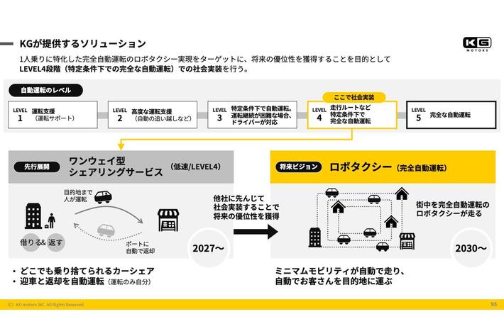 前述のソリューションは、KGモーターズが主体となって行うのではなく、ミニマムモビリティ(自動運転モデル)を購入したオーナーが貸し出せるプラットフォームを作り、手数料収入を得るビジネスモデルを考えている。これにより、各オーナーの課題に合わせて最適な導入が可能となり、新たな交通インフラとして普及させていく。