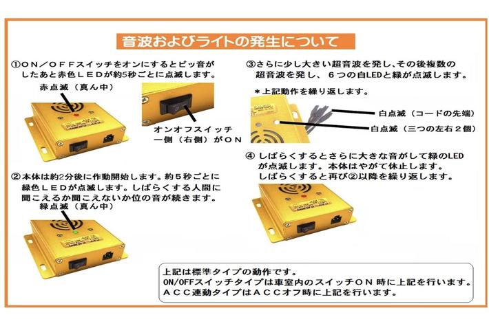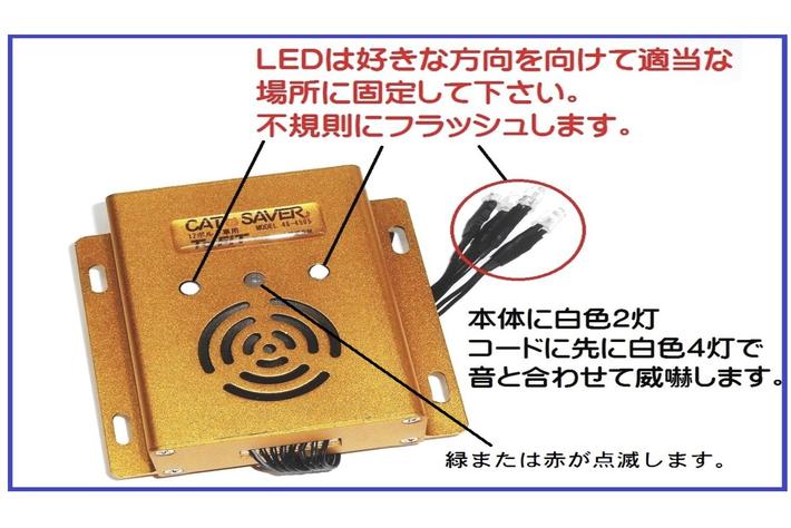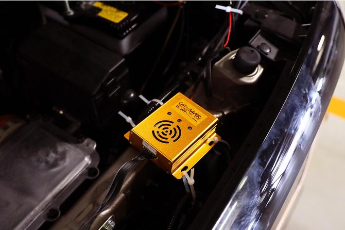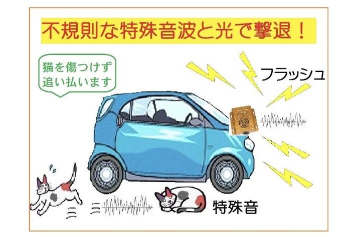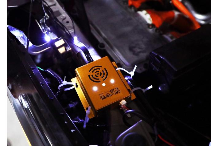 「キャットセイバーIII」は、エンジンルームなどに装着した本体から発生する音波や光によって、ネコがクルマの付近に滞在することを防ぐアイテムです。