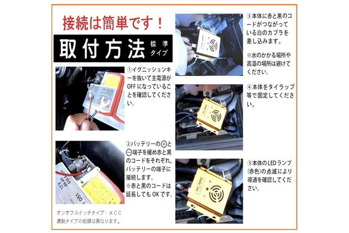 「キャットセイバーIII」の取り付けは、車載バッテリーのプラス/マイナス端子にコードを接続し、本体をフレームなどに固定させるだけのわずか2ステップです。