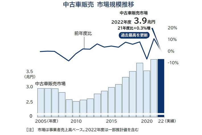 2022年度の中古車販売市場は、新車生産の遅れなどを背景に過去最高の3.9兆円に達した。