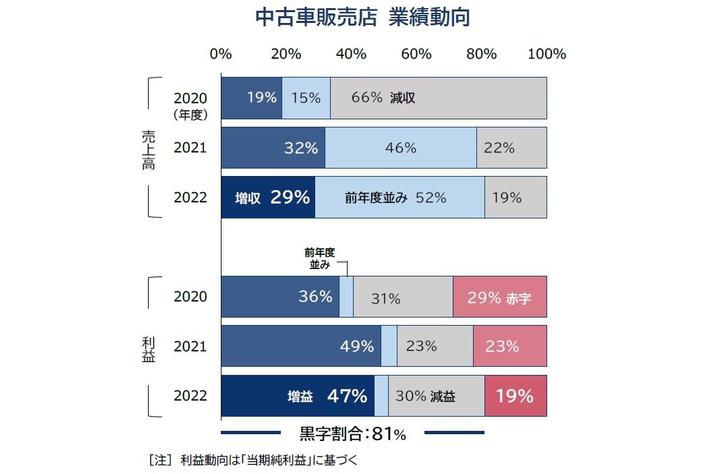 損益ベースでは、2022年度は「増益」が47%で最も多く、「減益」(30%)を含め81%が黒字となった。中古車需要の増加に伴い、中古車オークションなどの成約価格が高騰したことで仕入価格が上昇した一方、堅調な需要を背景に店頭価格へ価格転嫁しやすかった企業が多かったほか、利幅の大きい高価格帯のミニバンなどを取り扱うことで収益性を改善したケースも見られた。また、購入したユーザーを対象に車検など利益率の高い自動車整備ニーズも好調で、結果的に収益面では黒字となった企業が増加した。「赤字」となった企業では、店舗出店など業容拡大や、人件費の増加による販管費の増加を反映した企業が多かった。