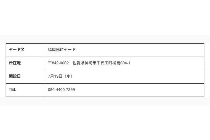 九州北部・東北地方での豪雨被害地域に対し災害復興支援チームを発足し、上記の臨時ヤードの開設を行い復興支援にあたっています。なお、搬入・搬出の際は事前にご連絡いただきますようお願いいたします。今後も、クルマ買取販売|ソコカラは、災害復興支援に尽力してまいります。