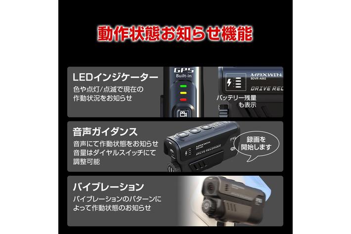 LEDインジケーター、音声ガイダンス、バイブレーションの3タイプのお知らせ機能によって、今まで不安だった「録画できているのか」「電源は入っているか」「現在どのモードで動作しているのか」を体感して知ることができます。